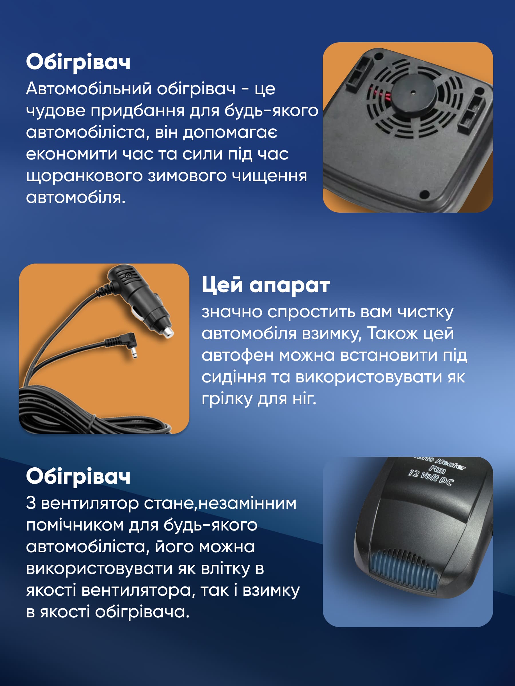 Обігрівач з вентилятором стане незамінним помічником для будь-якого автомобіліста, його можна використовувати як влітку в якості вентилятора, так і взимку в якості обігрівача.